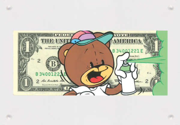 Badass Bear modèle unique sur Billet de 1 $ original présenté dans un cadre photo acrylique,